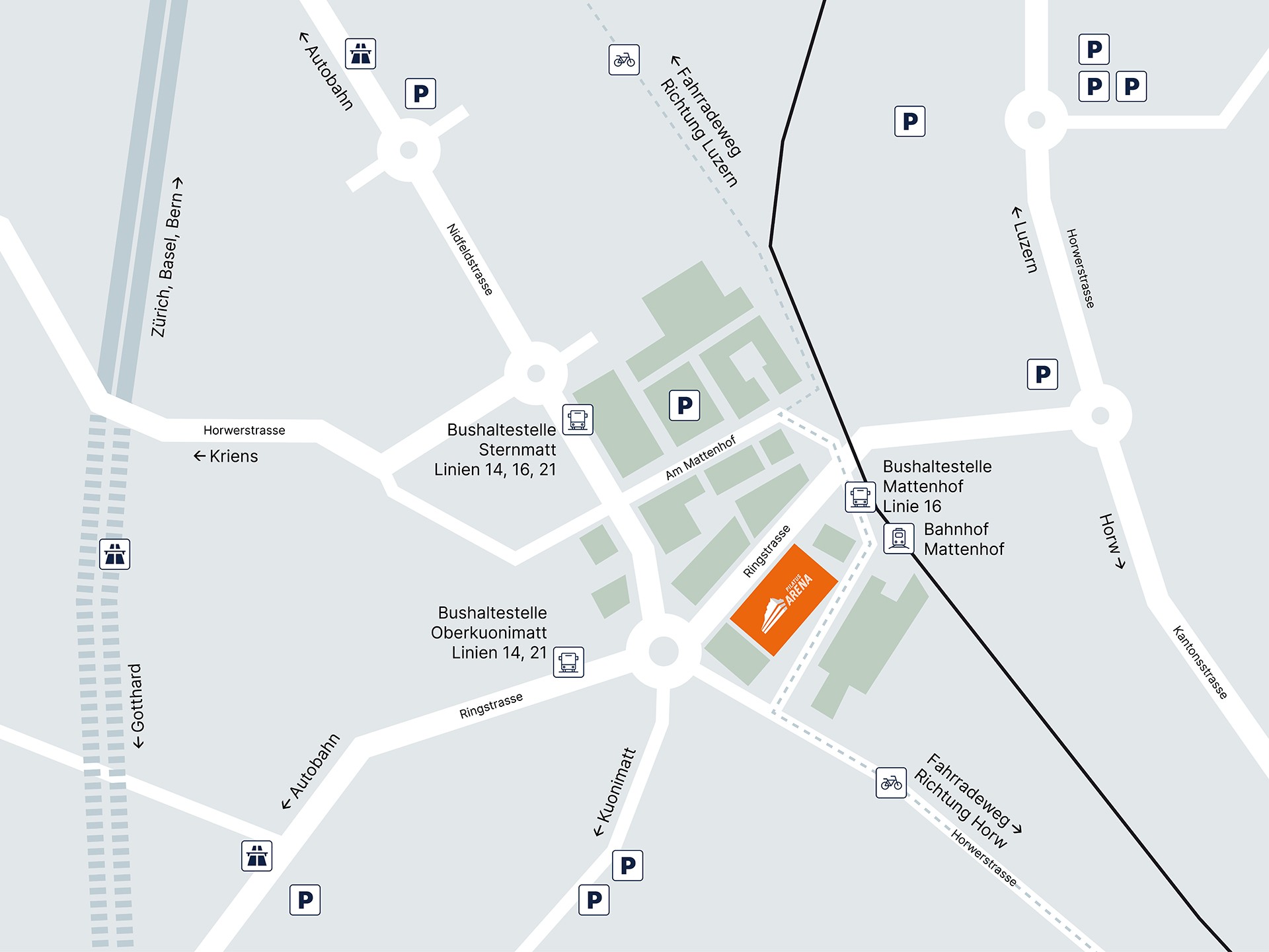 Die Verkehrsbetriebe Luzern bieten Ihnen eine bequeme Anreise zur PILATUS ARENA mit den Buslinien 14, 16 und 21.