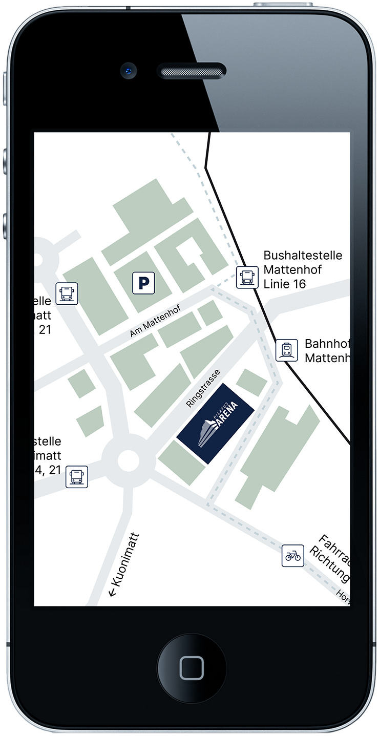Die PILATUS ARENA befindet sich fussläufig zur S-Bahnstation Kriens Mattenhof und ist bequem und schnell mit der Bahn erreichbar. Für Fahrradfahrer und motorisierte Zweiräder stehen auf dem Areal ausreichend Stellplätze zur Verfügung. Für eine Anreise mit dem Auto sind in der näheren Umgebung zahlreiche Parkmöglichkeiten vorhanden.