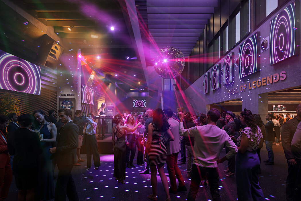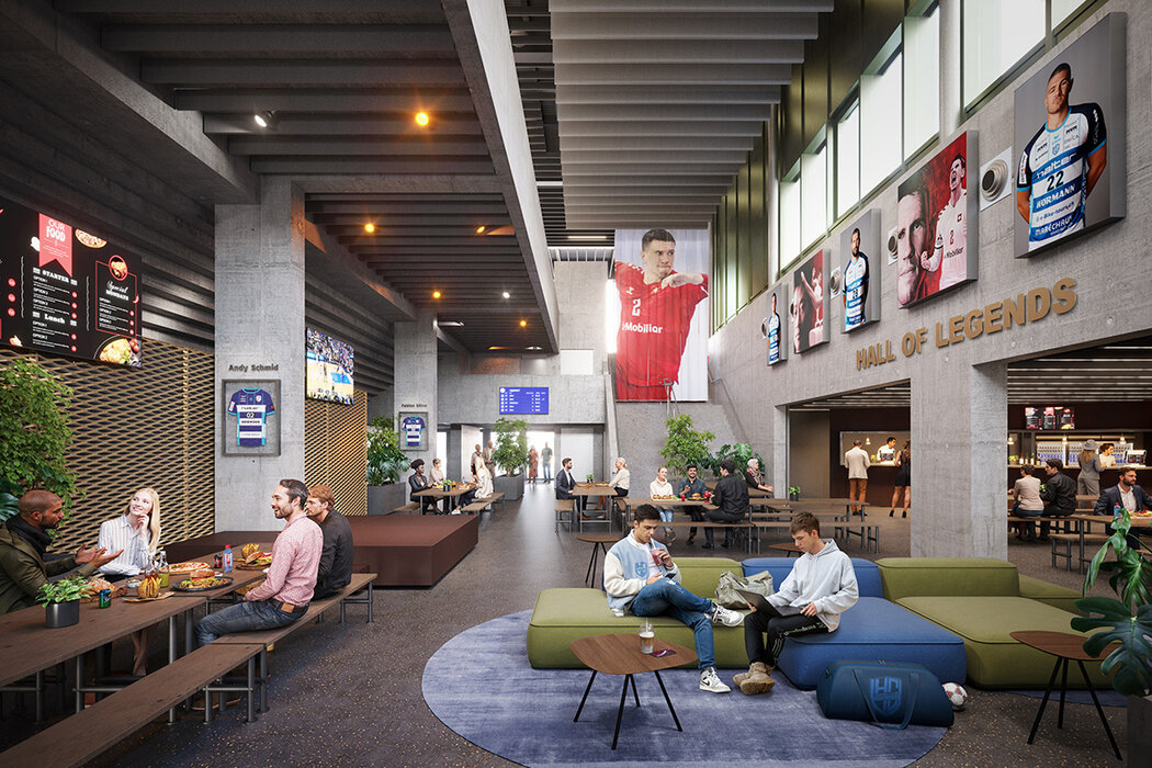 Das Foyer als Empfangshalle bei einem Grossevent in der Arena oder als Plenum mit Bühne und perfekter Präsentationstechnik für bis zu 800 Personen – inszeniert als HALL OF LEGENDS mit herausragenden Sportpersönlichkeiten aus aller Welt.